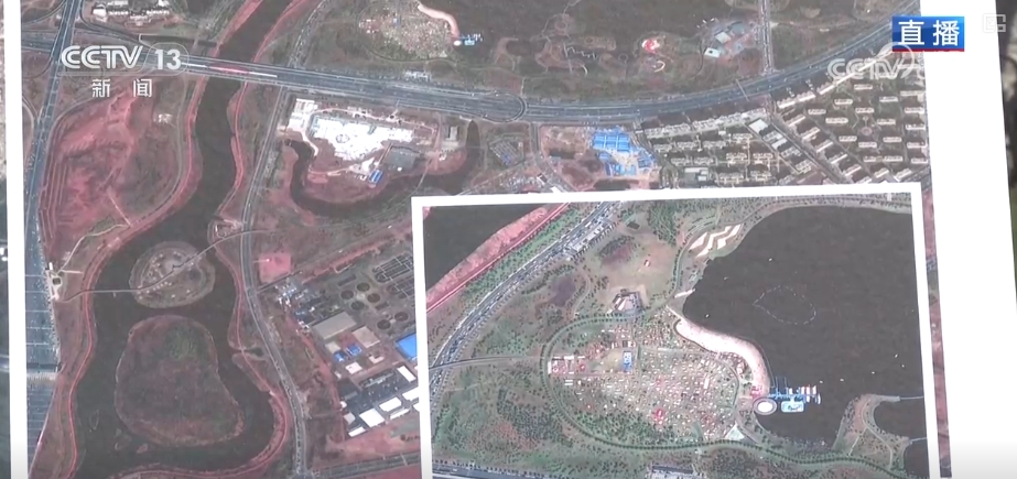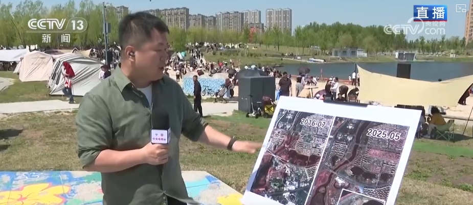 这项工程就是启动于2016年的伊通河综合治理工程。通过吉林一号卫星拍摄的影像可以看到,这是2016年7月的伊通河,河面上遍布着的刺眼的绿色物质,是当时黑臭水体滋生出的藻类,部分河道里呈现出浑浊的黄褐色,南溪湿地当时还是一片黄土裸露的荒草水塘。这是2025年5月卫星影像,伊通河中成片的藻类不见了,呈现出纯净的的水体,河道恢复到干净、整洁。而南溪湿地中的树木植被清晰可见,这些五颜六色的斑点,就是我们旁边这块帐篷营地上各式各样的帐篷,看上去非常壮观。