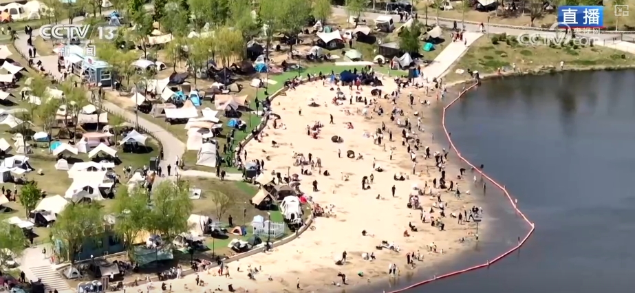 温暖和煦的天气吸引了近2万游客来此处游玩,绿地上已支起了几百顶花花绿绿的帐篷,这里是公园专门规划的帐篷营地。到了夜晚,湖中央喷泉还将上演音乐秀和水幕电影,不少人都冲着这场视听盛宴,来享受亲水时光。