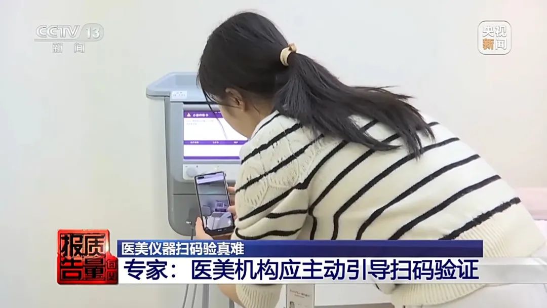 记者随机在浙江、江苏、湖南等地选取了一些价格在1万元以内的可开展射频治疗的美容机构进行调查。在其中一家医美机构,记者扫描仪器上面的二维码后显示一片乱码。 咨询师告诉记者,“这码贴在机器上就是为了应付消费者扫码的”。