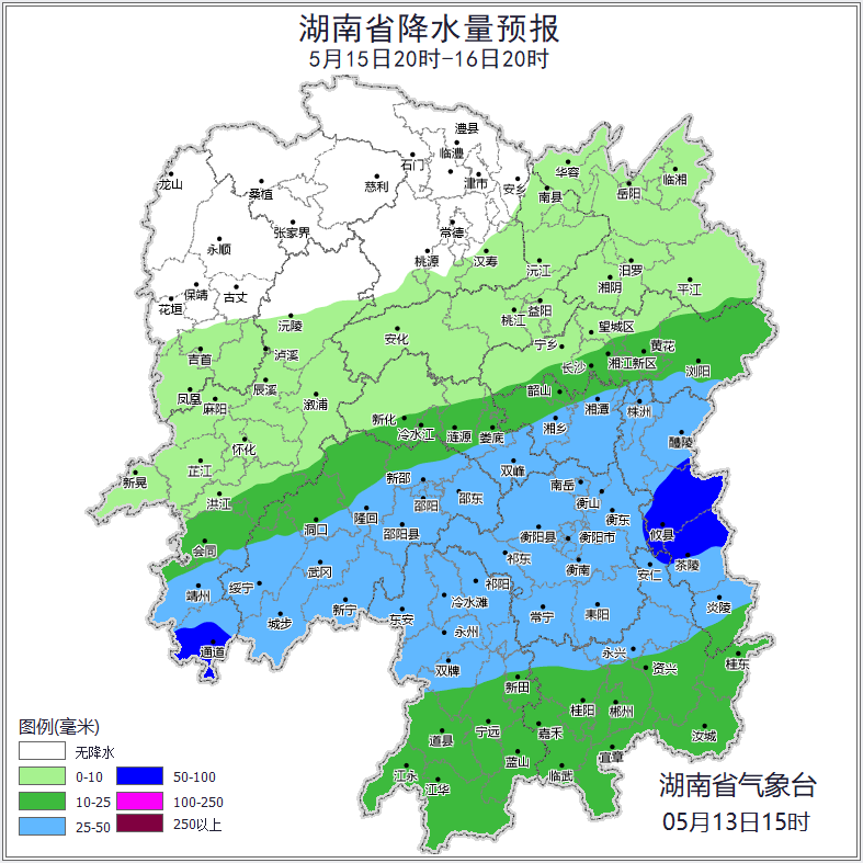 15日晚上至16日白天,湘中以南阴天有中到大雨,其中株洲中南部、衡阳东部、郴州北部、怀化南部局地有暴雨,其他地区小到中等阵雨或雷阵雨转多云;湘南南风2~3级,其他地区北风转南风2~3级,雷雨时阵风7级;最高气温26~30℃;最低气温18~22℃。