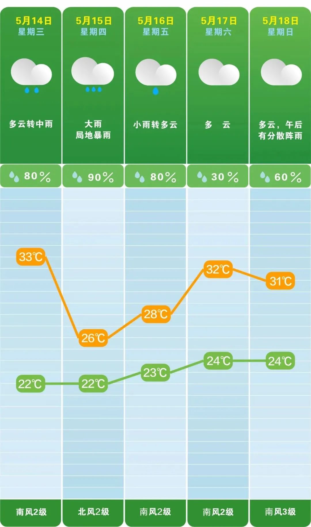 14日晚上至15日白天,湘中、湘东北阴天有中到大雨,其中长沙东部、株洲北部、怀化南部、邵阳南部局地暴雨,其他地区阴天,大部分地区有小到中等阵雨或雷阵雨;湘南南风2~3级,其他地区南风转北风2~3级,雷雨时阵风7级;最高气温26~29℃;最低气温18~22℃。