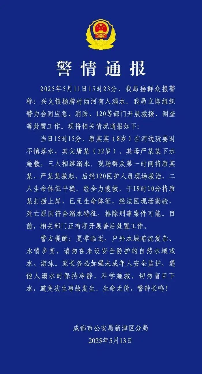 据“成都新津公安”通报,5月11日15时23分,四川成都市公安局新津区分局接群众报警称:兴义镇杨牌村西河有人溺水。当日15时15分,唐某某(8岁)在河边玩耍时不慎落水,其父唐某(32岁)、其母严某某下水施救,三人相继溺水。现场群众第一时间将唐某某、严某某救起,经全力搜救,于19时10分将唐某打捞上岸,已无生命体征。
