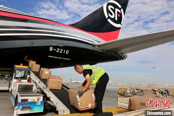 2024年8月15日,新疆乌鲁木齐地窝堡国际机场,顺丰航空一架全货机正在装运货物,准备飞往匈牙利首都布达佩斯。中新社记者 张宇 摄