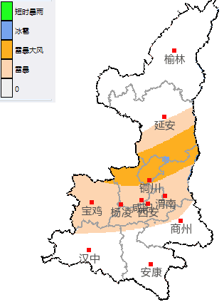 目前榆林市北部及西部县区、延安市北部县区已出现6~8级(10.8m/s-20.8m/s)大风,预计下述地区未来24小时内将受大风影响,平均风力5-6级(8m/s-13.8m/s),阵风7级(13.9m/s)以上,局地可达9级(20.8m/s)以上:西安市灞桥区、阎良区、临潼区、长安区、鄠邑区、高陵区、蓝田县、周至县、西咸新区,宝鸡市扶风县、岐山县、凤翔区、太白县、麟游县、千阳县、陇县、凤县,咸阳市秦都区、兴平市、武功县、三原县、泾阳县、礼泉县、乾县、永寿县、彬州市、淳化县、旬邑县、长武县,铜川市王益区、印台区、耀州区、宜君县,渭南市临渭区、韩城市、华阴市、华州区、潼关县、大荔县、澄城县、合阳县、蒲城县、富平县、白水县,延安市宝塔区、安塞区、黄陵县、黄龙县、宜川县、洛川县、富县、甘泉县、吴起县、志丹县、子长市、延川县、延长县,榆林市榆阳区、横山区、神木市、府谷县、定边县、靖边县、绥德县、米脂县、佳县、吴堡县、清涧县、子洲县,汉中市城固县、洋县、留坝县、佛坪县,安康市宁陕县,商洛市商州区、洛南县、丹凤县、商南县、山阳县、柞水县。另外,陕北部分地方伴有扬沙或浮尘天气,请注意防范。