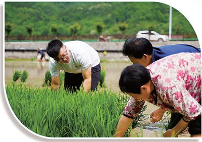 陕西佛坪县陈家坝村党支部书记王圆圆(左一)和村民一起拔秧苗。