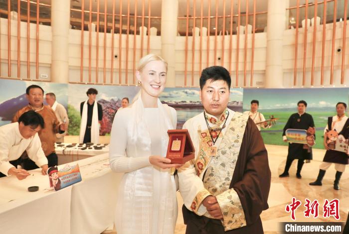 4月19日,“圣境甘南—中欧盛宴”暨甘南藏族自治州国际旅游推介活动在陕西西安举办。扎西当知布(右一)受邀参加,其个人绘制的微型唐卡受到外国嘉宾的喜爱。(受访者 供图)