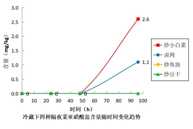 ●隔夜菜在冷藏储存下更安全。在冰箱中冷藏保存下放置48小时内,四种菜肴中亚硝酸盐的含量均没有明显变化,均为0毫克/千克;96小时内,炒小白菜和卤肉增长小于3毫克/千克。