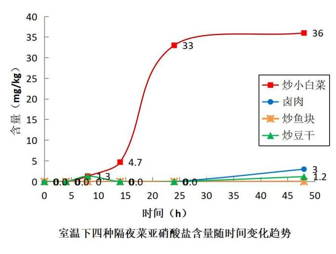 ●蔬菜类菜肴更容易产生亚硝酸盐。室温下,炒小白菜亚硝酸盐含量不断增加;且在24小时后,亚硝酸盐含量急剧增加至33毫克/千克,超过了限量值。卤肉、炒鱼块、炒豆干的亚硝酸盐含量则缓慢增加,放置48小时后小于3毫克/千克。