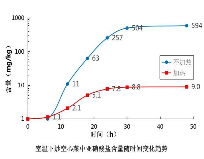 抽检的第二阶段实验增设了炒空心菜作为对照组。模拟家庭食用习惯,定时检测炒空心菜在微波加热与不加热,以及常温与冷藏条件下放置6小时、12小时、18小时、24小时、30小时、48小时后的亚硝酸盐含量。