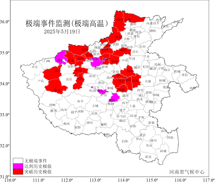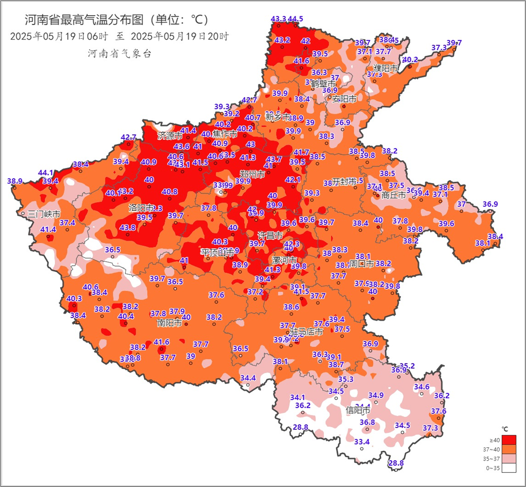 昨天我省淮河以北大部37℃以上,中西部、西北部40~43°C,林州、安阳、济源、郑州等23个国家级气象站日最高气温突破5月历史极值,酷热程度同期罕见。