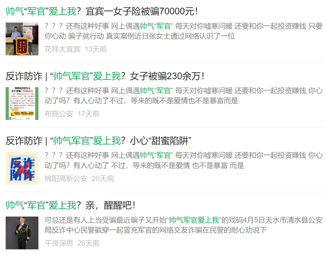 骗子冒充“军人”或“成功人士”等身份接近受害人,完美人设加温柔体贴很容易让人产生恋爱的幻觉。网络交友需谨慎,尤其在涉及金钱往来时一定要提高警惕。