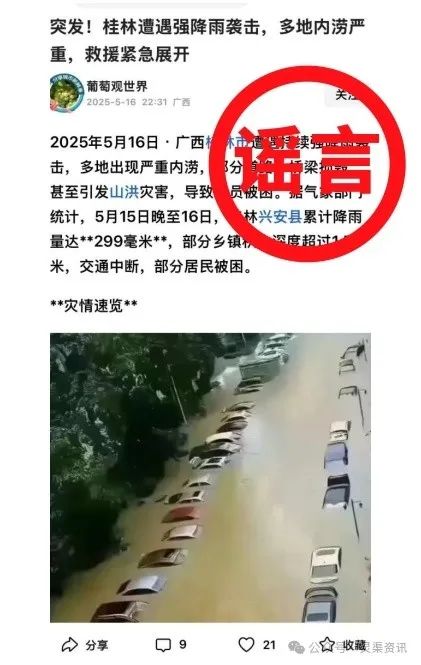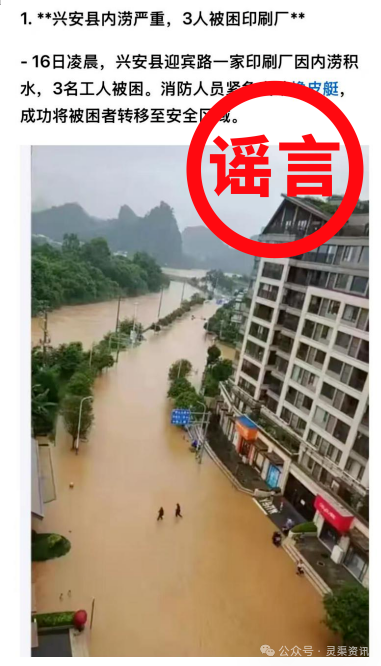 近日,有网民在某网络平台发文并配图称“5月15日晚至16日,桂林兴安县累计降雨量达299毫米,部分乡镇积水深度超过1.5米,交通中断,部分居民被困”“16日凌晨,兴安县迎宾路一家印刷厂因内涝积水,3名工人被困”。