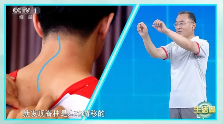 此外,伸出两个手指头摸着棘突,也就是后背上骨头最高的地方,顺着往下拉,也可以观察脊柱是否出现了问题。
