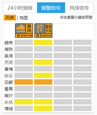 截至21日17时20分,广州越秀、天河、白云、花都、从化、增城区均发布雷雨大风黄色或以上预警信号。