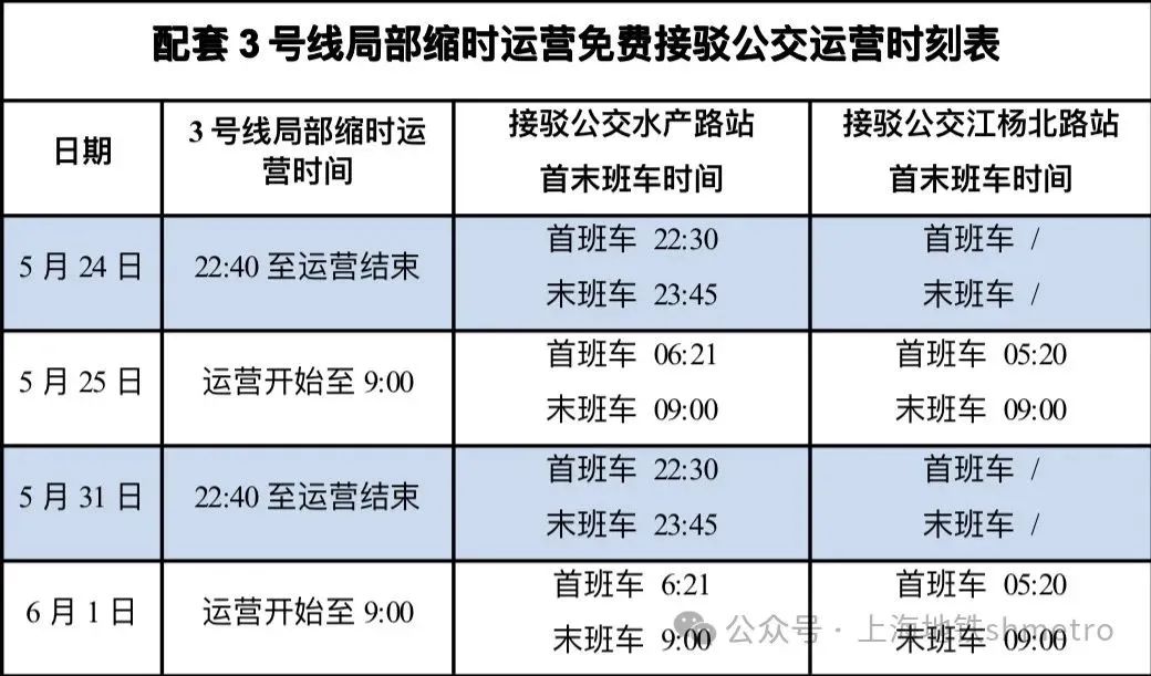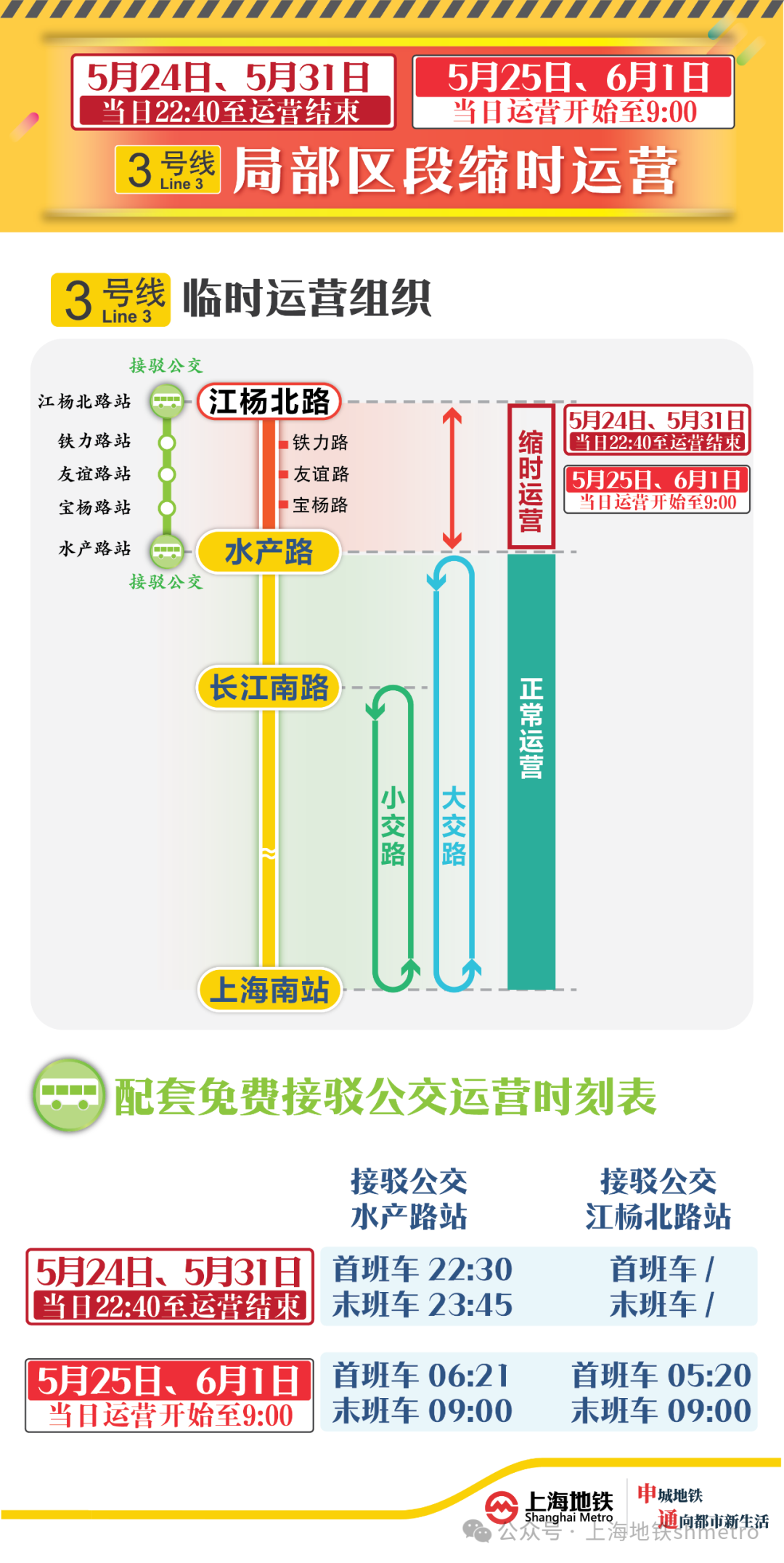 同时,受施工影响的水产路站至江杨北路站区段双向运营由免费接驳公交进行替运。(具体详见以下时刻表)