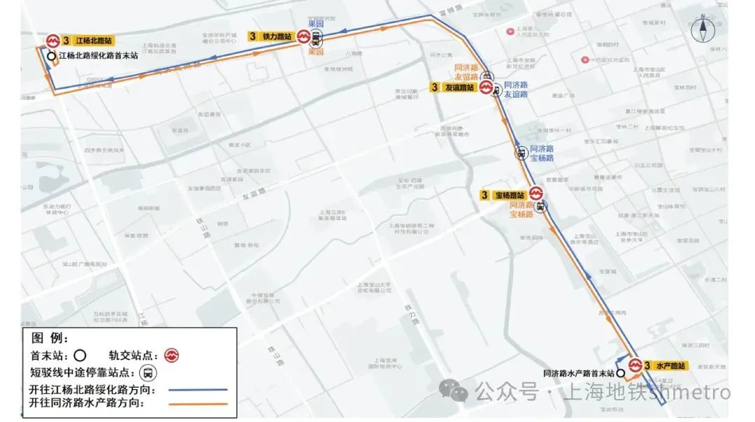 3号线水产路站(不含)—江杨北路站(中途停靠宝杨路站、友谊路站、铁力路站)