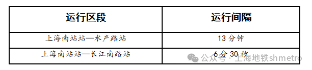 在局部缩时运营期间,3号线北段终点站临时调整为水产路站,开行“上海南站站—水产路站”及“上海南站站—长江南路站”大小两个交路。其中,大交路“上海南站站—水产路站”运行间隔为13分钟,小交路“上海南站站—长江南路站”运行间隔为6分30秒。
