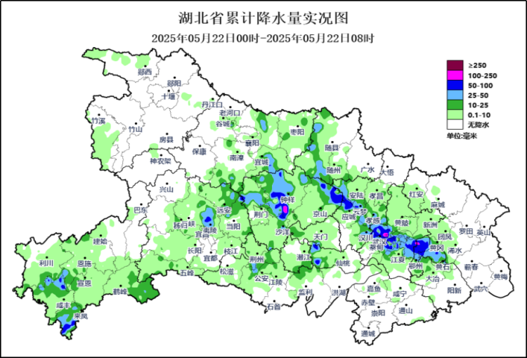 今日(22日)00时至08时,恩施、宜昌、襄阳、荆门、孝感、武汉、鄂州、黄冈等地累计雨量超过50毫米,其中武汉硚口、东西湖、汉阳、经开和钟祥、京山、鄂州城区、来凤等地超过100毫米,最大雨量为钟祥柴湖镇133.3毫米,最大小时雨强为钟祥市柴湖镇82.8毫米(22日07时),宜昌、荆州西部、随州、孝感、武汉等地还出现8到10级雷暴大风,最大为江岸区二七街道27.2米/秒(10级,22日04时)。