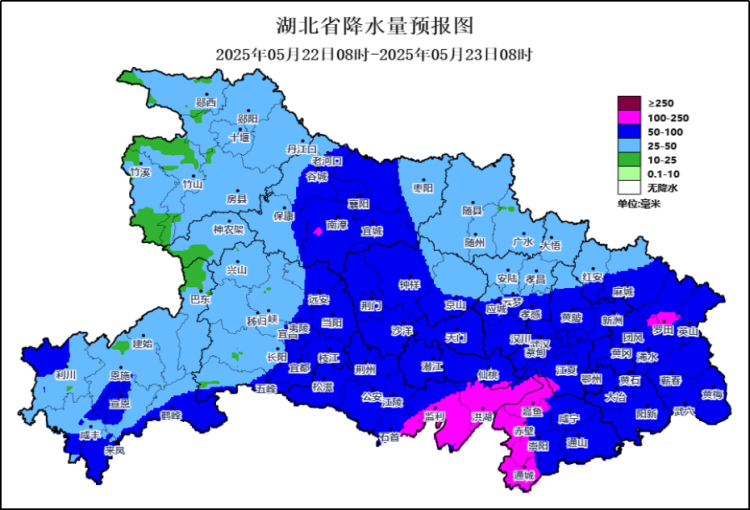 预计,5月22日08时至23日08时,重庆东南部、贵州东部和南部、云南东南部、湖北大部、湖南大部、河南中南部、安徽西部和中南部、江西中北部、浙江西部、福建北部、广西北部和西部以及内蒙古中部、山西北部、河北西北部等地部分地区有大到暴雨,其中湖北中东部、安徽西南部、湖南东北部、江西北部、广西北部和西部等地部分地区有大暴雨(100~220毫米)。上述部分地区伴有短时强降水(最大小时降雨量20~50毫米,局地可超过70毫米),局地有雷暴大风等强对流天气。