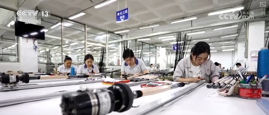山东威海的钓具早已蜚声海外,这里聚集了近5000家钓具生产及贸易企业,包揽了全球六成鱼竿市场份额。在这家规模较大的生产企业里,碳纤维鱼竿从自动流水线鱼贯而下,即将发往欧洲市场。2025年以来,企业出口额达2.1亿元,同比增长27%。