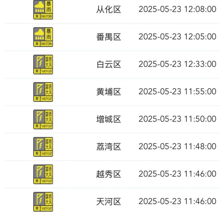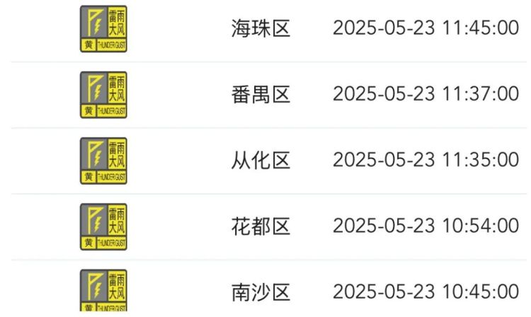 到5月23日12时35分,广州市各区均发布了雷雨大风黄色预警信号,番禺区、从化区发布了暴雨黄色预警信号。