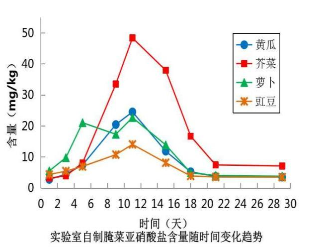 近期,厦门市市场监督管理局开展一项研究性抽检,观察酱腌菜中亚硝酸盐的变化规律。研究选取四种常见酱腌菜食材,包括:芥菜、豇豆、萝卜和黄瓜。在实验室中模拟家庭自制酱腌菜过程,并定时检测亚硝酸盐含量