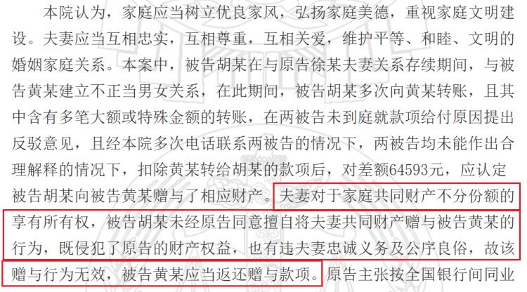 综上,判决确认被告小胡赠与被告黄某64593元款项的行为无效;被告黄某返还原告小徐64593元,并赔偿利息损失。