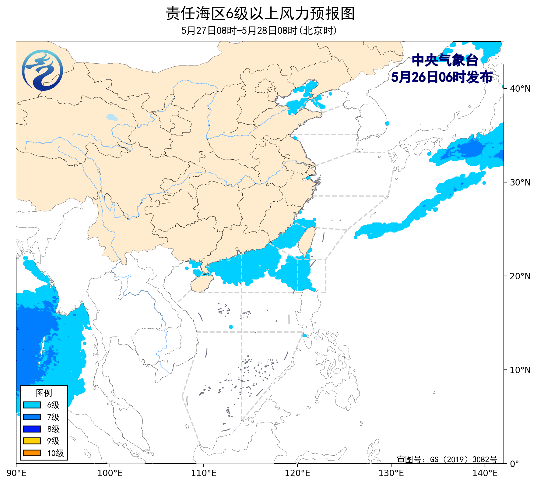 5月25日14时至26日02时,台湾海峡、台湾以东洋面、巴士海峡、南海北部海域、北部湾出现了5~7级、阵风8级的偏北风或东北风。黄海北部海域出现了能见度不足1公里的大雾。
