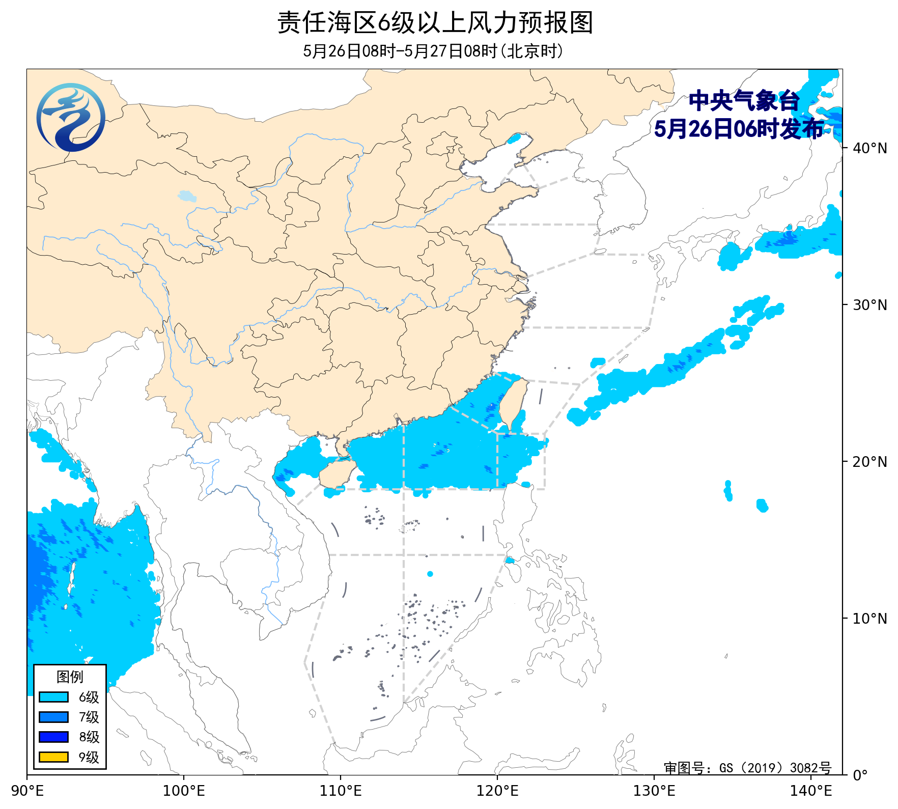26日08时至27日08时,台湾海峡、巴士海峡、北部湾、琼州海峡、南海北部海域将有5~6级、阵风7级的偏东到东北风。