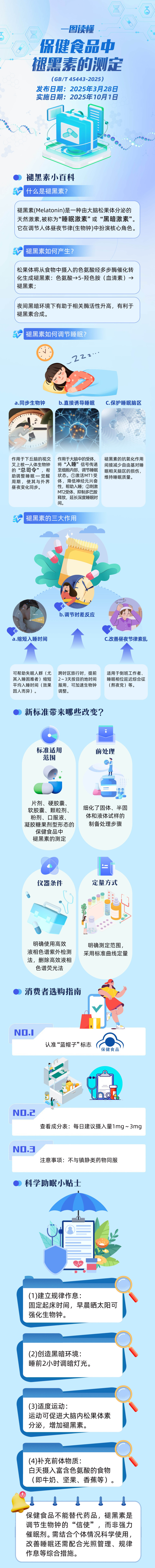 记者今天(26日)了解到,由全国特殊食品标准化技术委员会组织修订的推荐性国家标准《保健食品中褪黑素的测定》正式发布,将于2025年10月1日起实施。