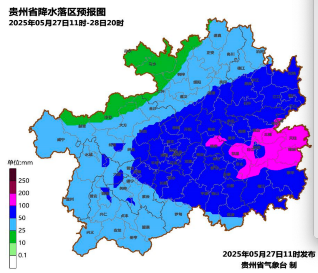 据贵州省气象台预报,5月27日夜间,贵州省毕节市南部、遵义市东南部、六盘水市东部、安顺市、贵阳市中南部、铜仁市中南部、黔南州中北部、黔东南州等地将有强降雨天气,过程累计降水量普遍在50~100毫米,贵州东部局地可达120~150毫米。贵州省防汛抗旱指挥部决定,于5月27日12时启动省级防汛四级应急响应。
