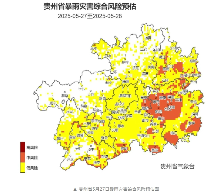 贵州省气象局5月27日11时发布暴雨黄色预警:预计05月27日11时至28日20时,贵阳市(所有区域),六盘水市东部(六枝、水城),遵义市东南部(播州、凤冈、红花岗、湄潭、余庆),安顺市(所有区域),毕节市南部(纳雍、金沙、黔西、织金),铜仁市(除沿河外的所有区域),黔西南州(兴仁、晴隆),黔东南州(所有区域),黔南州(所有区域)将出现暴雨(50~99毫米),其中铜仁市(玉屏),黔南州(福泉、瓮安),黔东南州(除从江外的所有区域)局地将出现大暴雨(100~200毫米)。