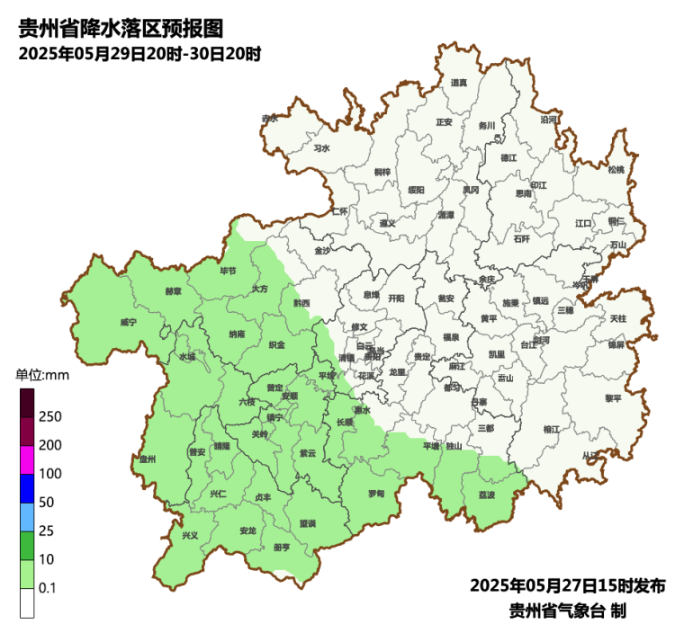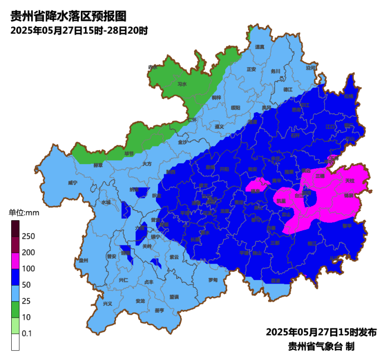 今天下午到明天上午,全省阴天有阵雨或雷雨,雨量普遍中到大雨,铜仁市中南部、遵义市南部、毕节市南部、六盘水市东部、安顺市大部、贵阳市、黔南州大部、黔东南州局地有暴雨,其中,黔东南州中北部和黔南州北部、铜仁市东南部的部分乡镇有大暴雨;