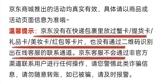精准包装诱惑 : 骗子精心设计制作与京东官方卡券相似的 “京东超市卡”“京东 E 卡”“京东补贴卡” 等,卡片上声称扫码即可领取高额购物卡、现金补贴及精美礼品,诱使大家上钩。