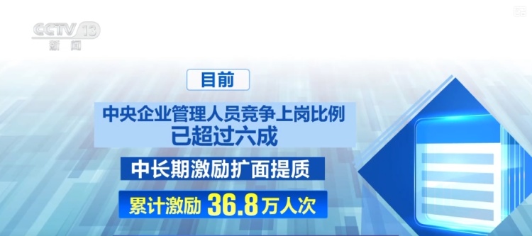 目前,中央企业管理人员竞争上岗比例已超过六成,中长期激励扩面提质,累计激励36.8万人次。