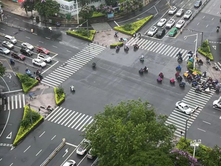 5月29日早上,南宁市区下雨,市民出行纷纷穿上雨衣。