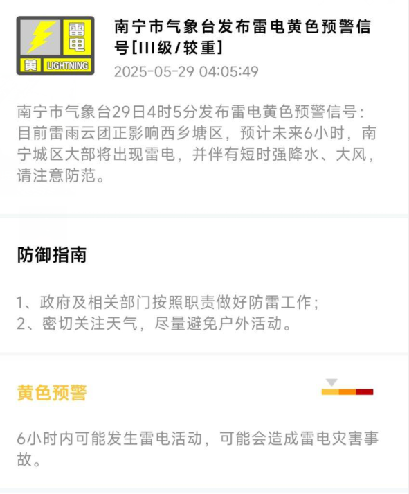 南宁市气象台29日4时5分发布雷电黄色预警信号:目前雷雨云团正影响西乡塘区,预计未来6小时,南宁城区大部将出现雷电,并伴有短时强降水、大风,请注意防范。