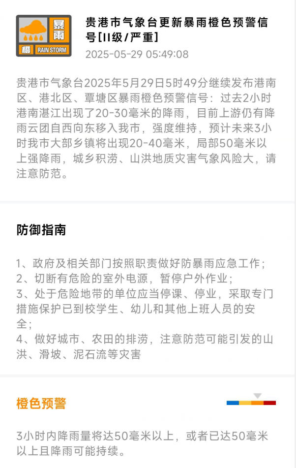 贵港市气象台5月29日5时49分继续发布港南区、港北区、覃塘区暴雨橙色预警信号:过去2小时港南湛江出现了20~30毫米的降雨,目前,上游仍有降雨云团自西向东移入贵港市,强度维持,预计未来3小时大部乡镇将出现20~40毫米,局部50毫米以上强降雨,城乡积涝、山洪地质灾害气象风险大,请注意防范。