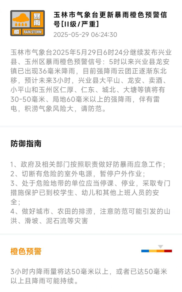 玉林市气象台5月29日6时24分继续发布兴业县、玉州区暴雨橙色预警信号: 5时以来兴业县龙安镇已出现36毫米降雨,目前强降雨云团正逐渐东北移,预计未来3小时,兴业县大平山、龙安、卖酒、小平山和玉州区仁厚、仁东、城北、大塘等镇将有30~50毫米、局地60毫米以上的强降雨,伴有雷电,积涝气象风险大,请防范。
