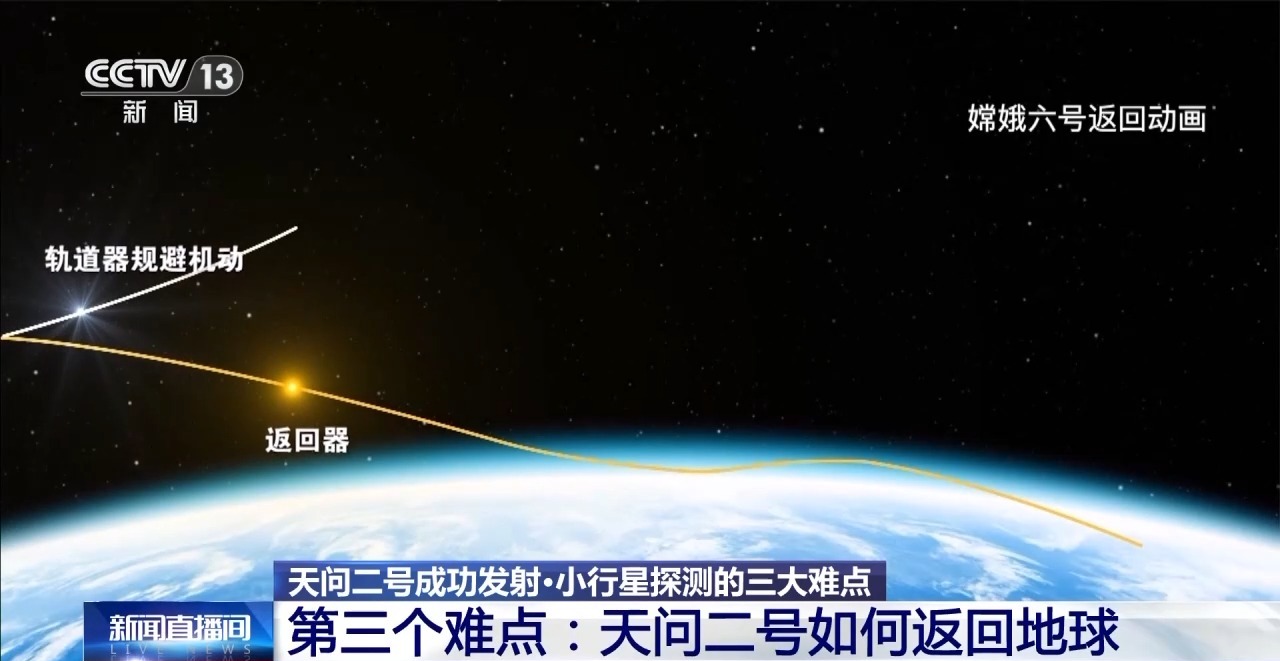 第三大难点,就是在拿到样品后,天问二号要如何返回地球。与以往嫦娥五号、嫦娥六号等航天器采用的半弹道跳跃式再入方式不同,天问二号进入大气层不再“打水漂”,因此需要承受超过第二宇宙速度再入而带来的极大过载。