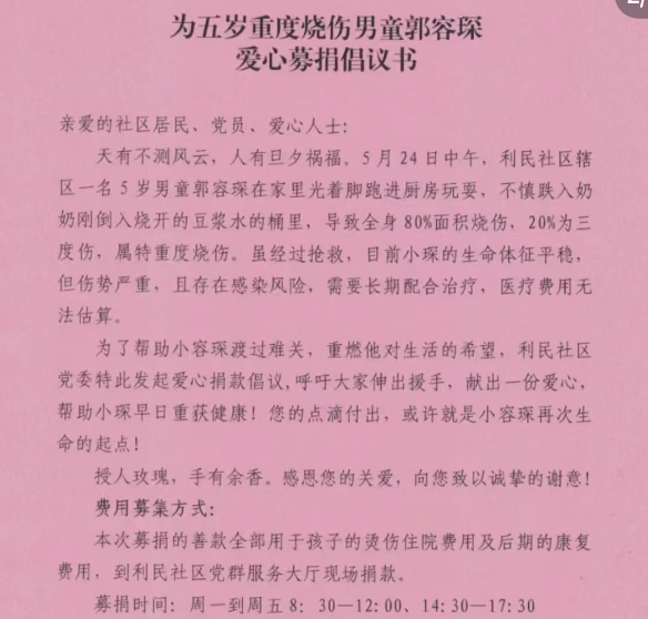 5月28日,利民社区居委会发布爱心募捐倡议书,呼吁大家献出爱心。据居委会的工作人员透露,“(男童)除了头之外几乎都烫伤了。”