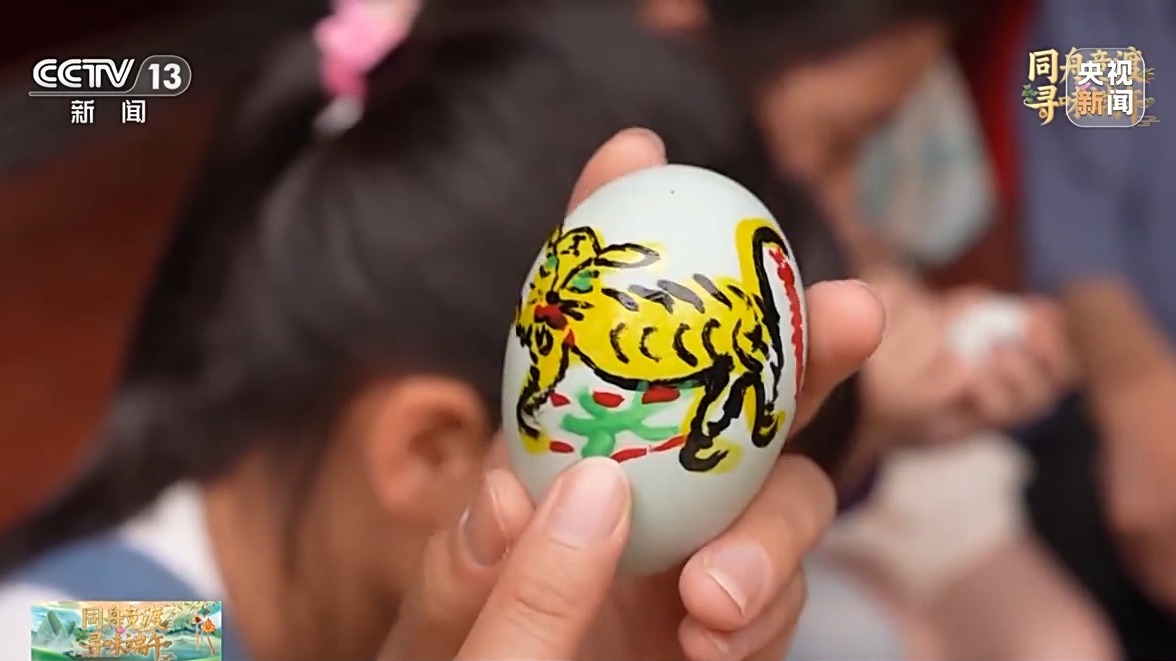 总台记者 彭雨佳:端午节不但要吃午时蛋,还要画虎蛋。“虎蛋”有多种图案,现在我画的这个,就是最常见的一种。大家看,上面有一只老虎,在老虎的旁边,我们还要画上蜘蛛、蜈蚣、壁虎等“五毒”。既是用画笔传递的祝愿,也是端午节独特的民俗美学。
