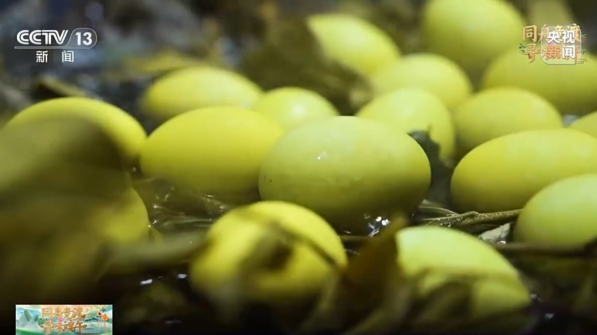 按照当地传统,制作午时蛋,要在端午节这天,用正午时分打上来的井水来烧煮,也就是“午时水”。煮蛋时,要先把午时草铺在锅底,再放入鸭蛋。接着,加入午时水炖煮。慢慢地,鸭蛋会呈现出鲜艳的黄色,一口下去,满嘴草药清香。