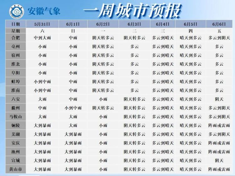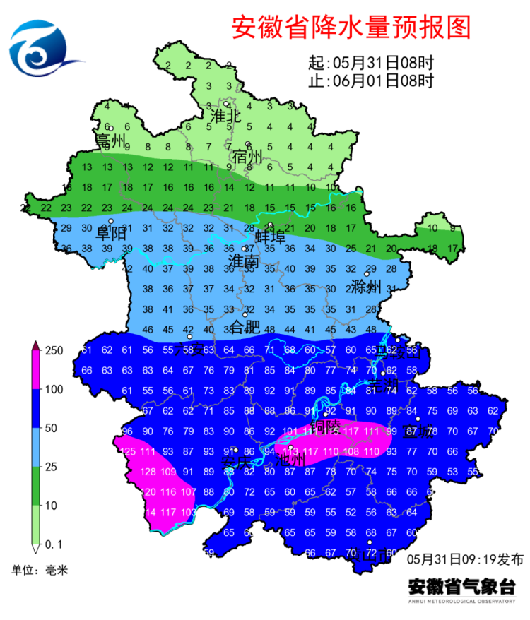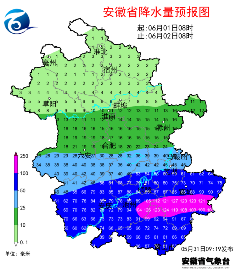 据省气象部门预报,今明两天我省有一次明显降水过程,淮河以南有大雨,江淮之间中南部和江南暴雨,局部大暴雨,同时伴有7级左右阵风。强降水集中时段为5月31日夜里至6月1日白天。此次过程最大雨强20~40毫米/小时,局部超过40毫米/小时。过程最大累计雨量:江淮之间南部和江南(安庆、铜陵、池州、芜湖、宣城、黄山)100~160毫米;江淮之间北部25~50毫米;淮北地区10~25毫米。6月2日降水减弱逐渐停止。