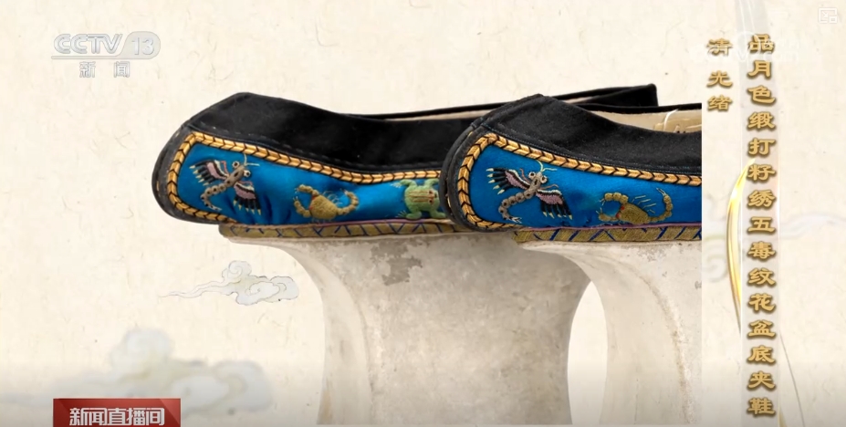 这个蓝色的双鞋面上也绣着“五毒”,仿佛在脚下形成防毒“屏障”。