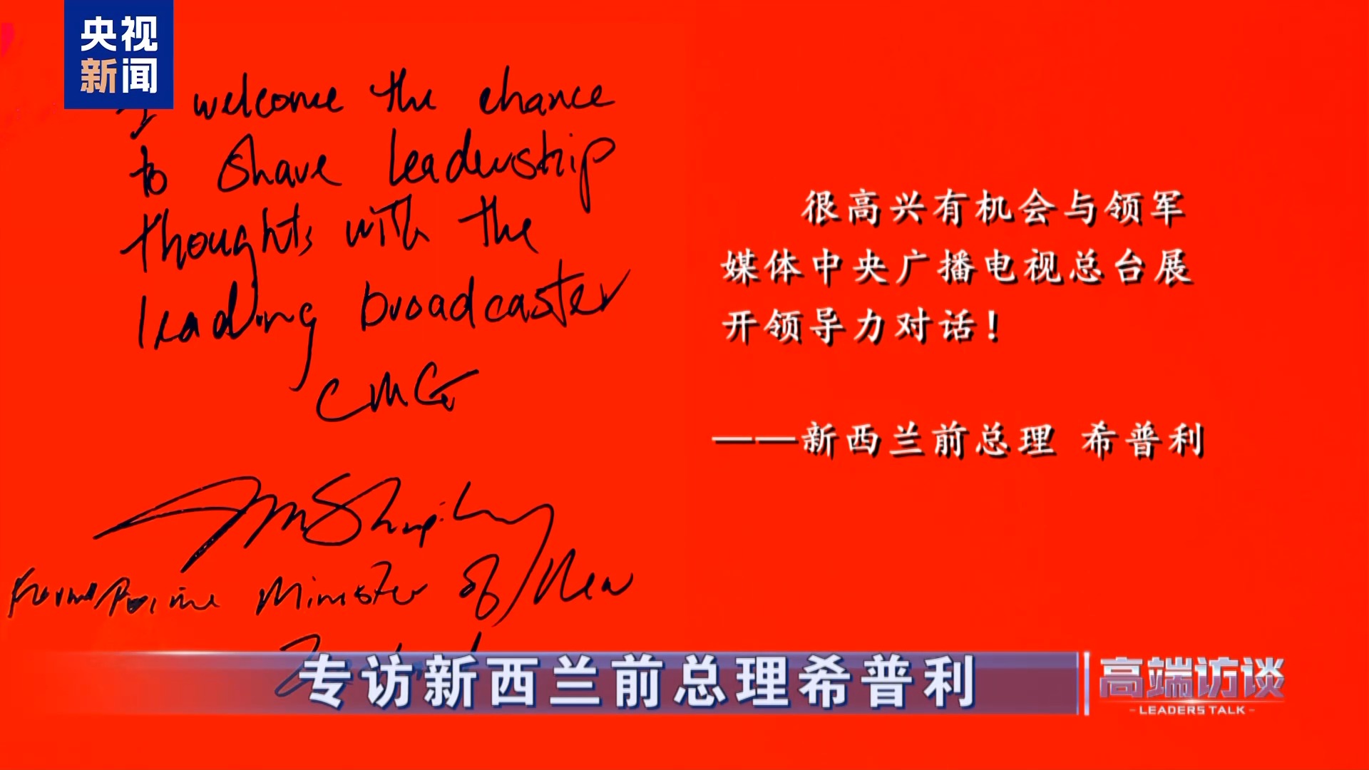 △新西兰前总理希普利在接受总台专访后题词