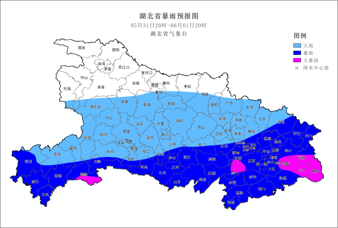 预计5月31日晚上至6月1日白天,恩施、宜昌南部、荆州、天门、潜江、仙桃、武汉、鄂州、黄石、黄冈、咸宁有暴雨,恩施东部、荆州东部、咸宁北部、黄石东部、黄冈南部局地大暴雨;1日晚上降雨逐步减弱结束。