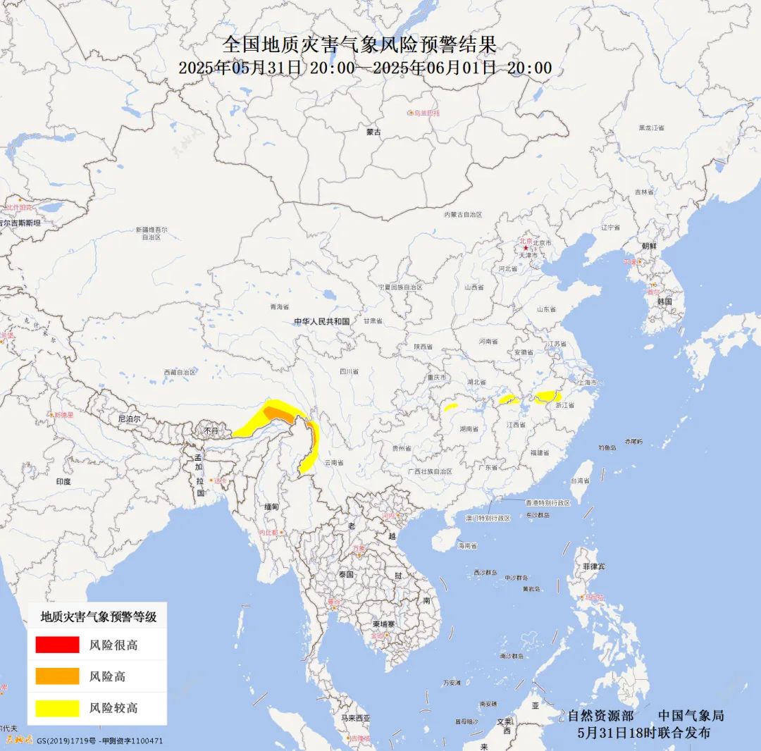 2025年5月31日20时至6月1日20时,浙江西部、安徽南部、江西北部局部、湖北东南部、湖南西北部、云南西部、西藏东南部发生地质灾害的风险较高(黄色预警);云南西北局部、西藏东南局部发生地质灾害的风险高(橙色预警)。