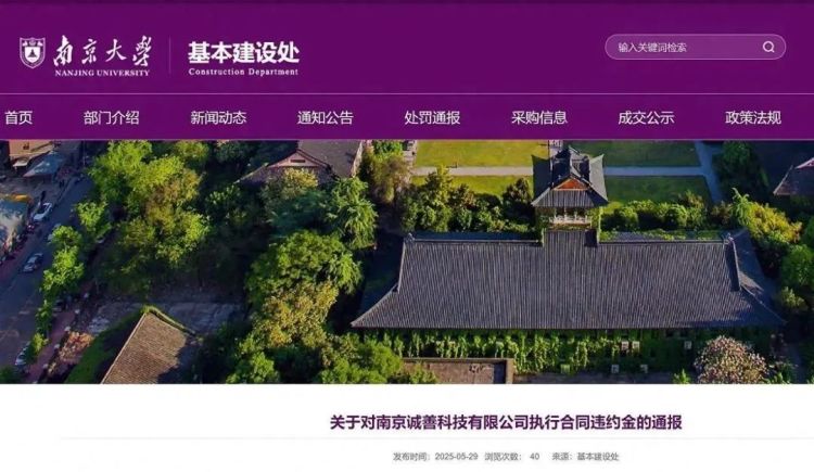 5月29日,南京大学基本建设处发布《关于对南京诚善科技有限公司执行合同违约金的通报》。