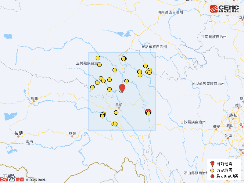 历史地震: 根据中国地震台网速报目录,震中周边200公里内近5年来发生3级以上地震共38次,最大地震是2025年4月26日在四川甘孜州白玉县发生的4.9级地震(距离本次震中196公里),历史地震分布如图。